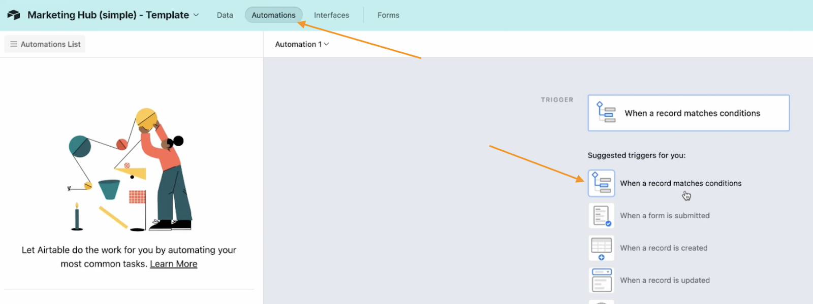 - Go to the base or hub that you’re working on. Click on ‘Automations’ in the top bar, then click the suggested trigger ‘When a record matches conditions’