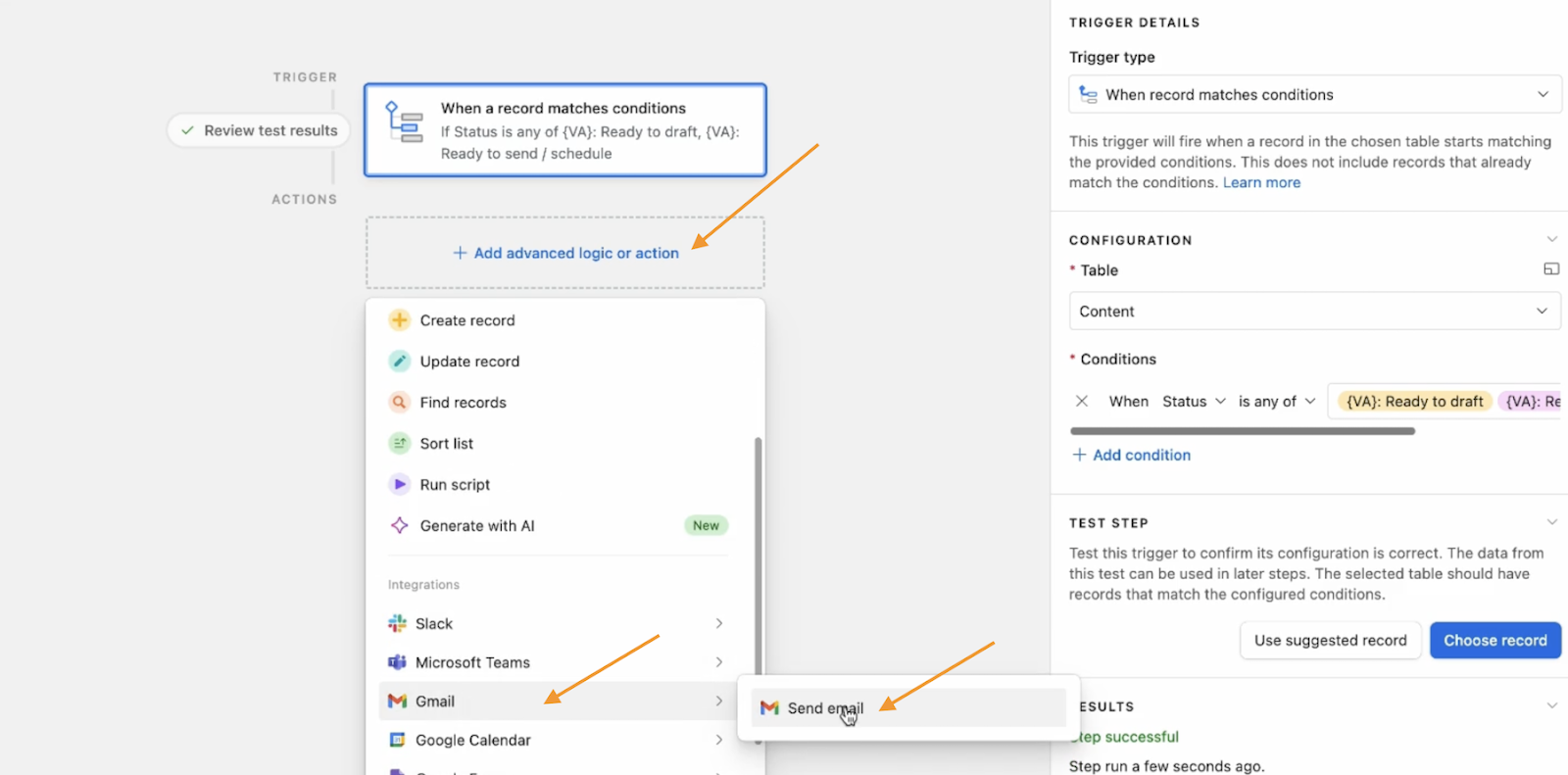 - Click on the ‘Add advanced logic or action’, and scroll down to ‘Gmail’ and ‘Send email’
