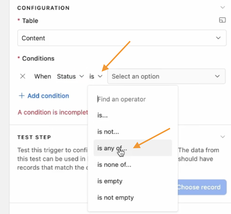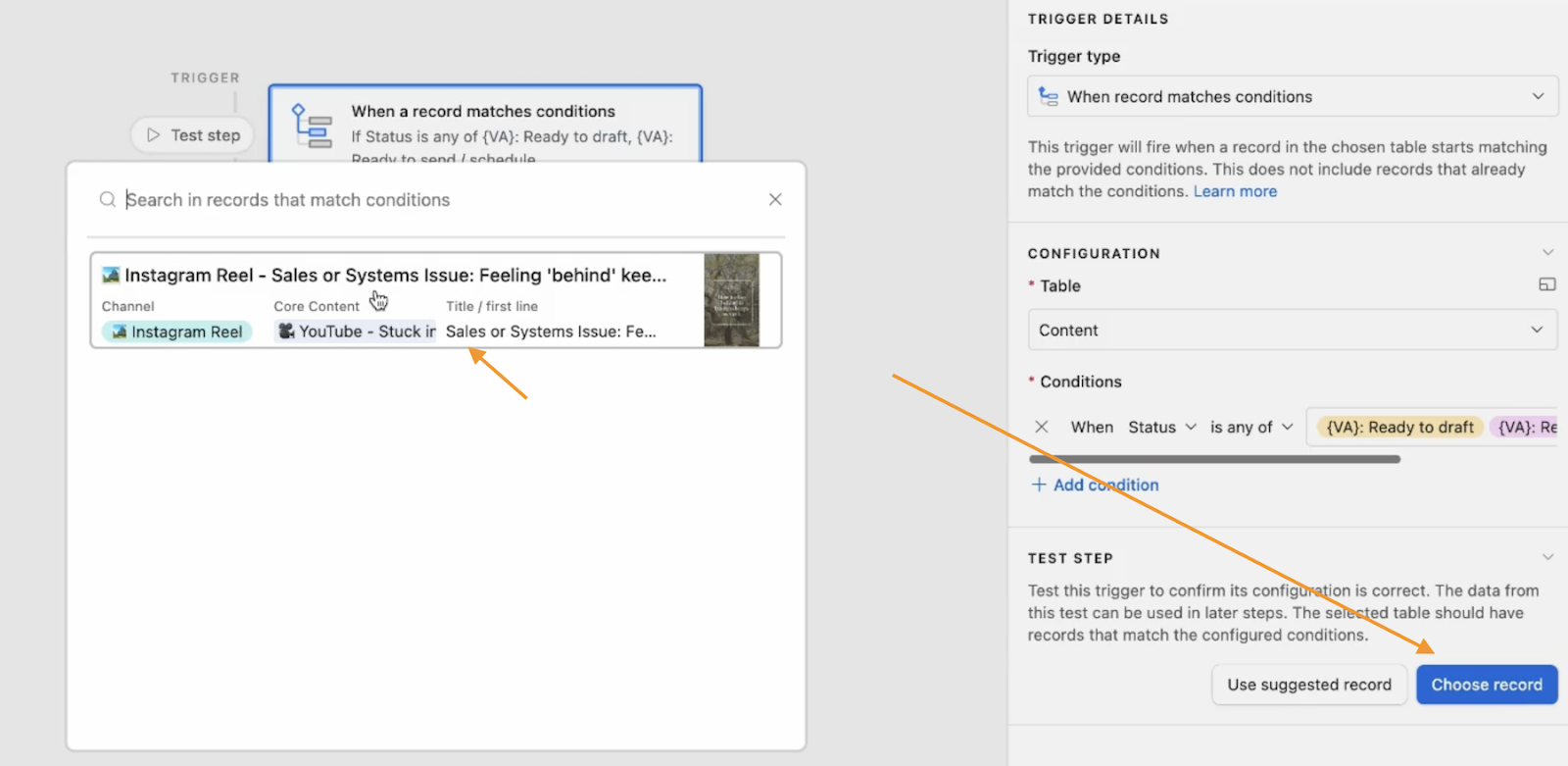 - To test the automation, Airtable will prompt you to choose a record. Click the ‘choose record’ button and select one.