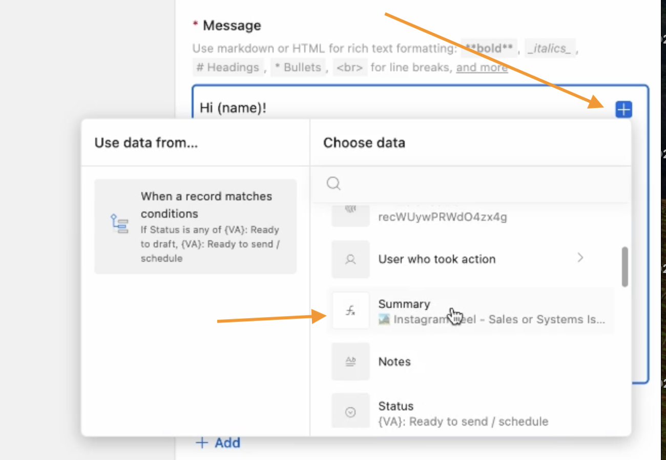 - Note the text in grey underneath the heading is Airtable pulling through the text from the sample record you selected in the first step.