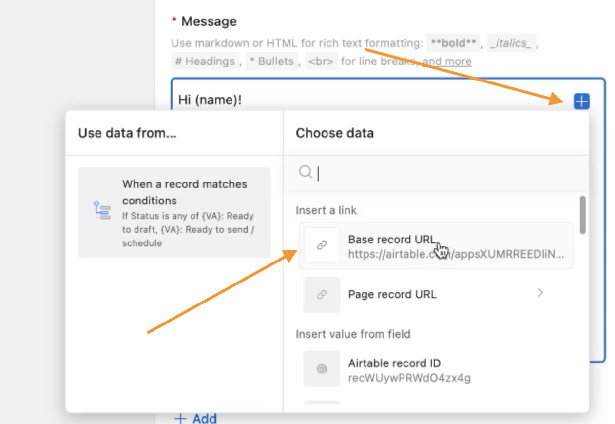 - Do the same for space beneath ‘here’s the link to action’; click under that line, then click the blue box in the top-right corner and select ‘Base record URL’; this will link directly to that specific record.