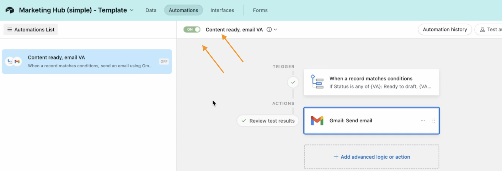 - Finally, rename the automation, e.g., ‘Content ready, email VA’ and toggle the automation ‘ON’.