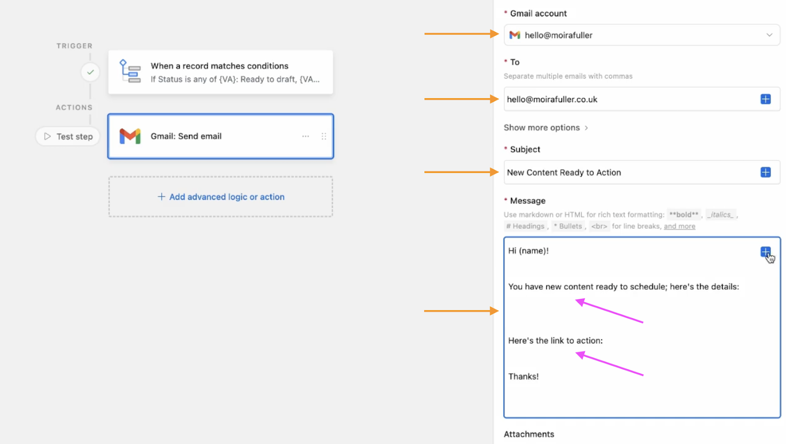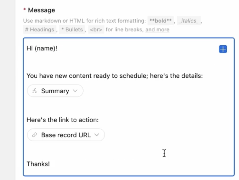 - Message: Start with the main text that will be the same in every email, and then we’ll add in ‘dynamic’ text in a second. E.g.,