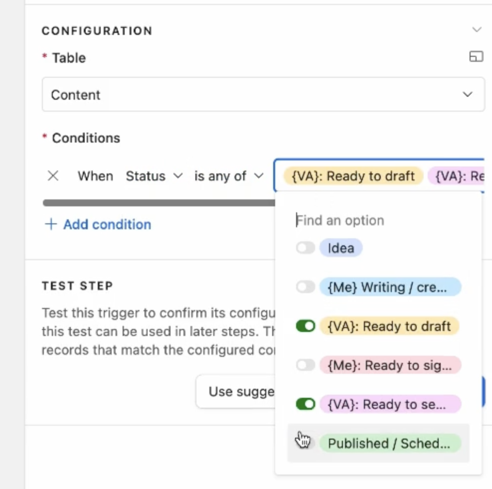 - If none come up, go back into your Airtable table, change the status on one of the lines to the status you’re using (while you set up this automation), then you can change the status back after you’ve tested it.